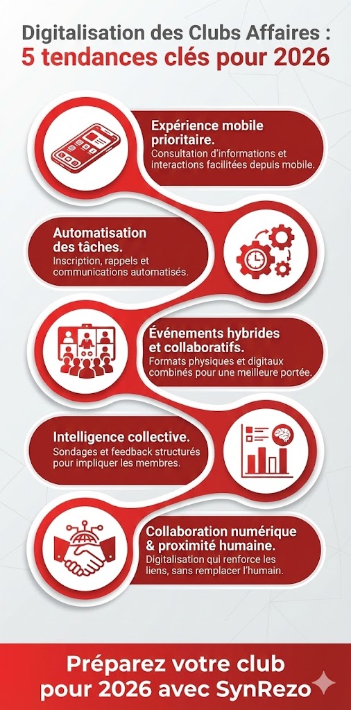 À l’aube de 2026, la digitalisation n’est plus un sujet d’avenir pour les Clubs Affaires : elle est devenue une composante essentielle pour rester pertinent, attractif et organisé dans un environnement d’affaires de plus en plus connecté. Les modalités de réseautage évoluent, les attentes des membres aussi, et les animateurs de clubs sont confrontés à des besoins nouveaux en matière d’efficacité, d’écoute des adhérents et de pilotage. Ce mouvement ne touche pas seulement les clubs de notoriété nationale : même les réseaux locaux, franchises en devenir doivent désormais penser leur présence digitale de façon stratégique.